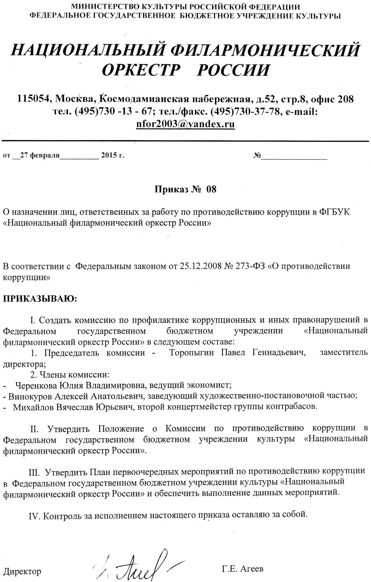 (Приказ № 08) Положение Комиссии по противодействию коррупции в ФГБУК «НАЦИОНАЛЬНЫЙ ФИЛАРМОНИЧЕСКИЙ ОРКЕСТР РОССИИ»