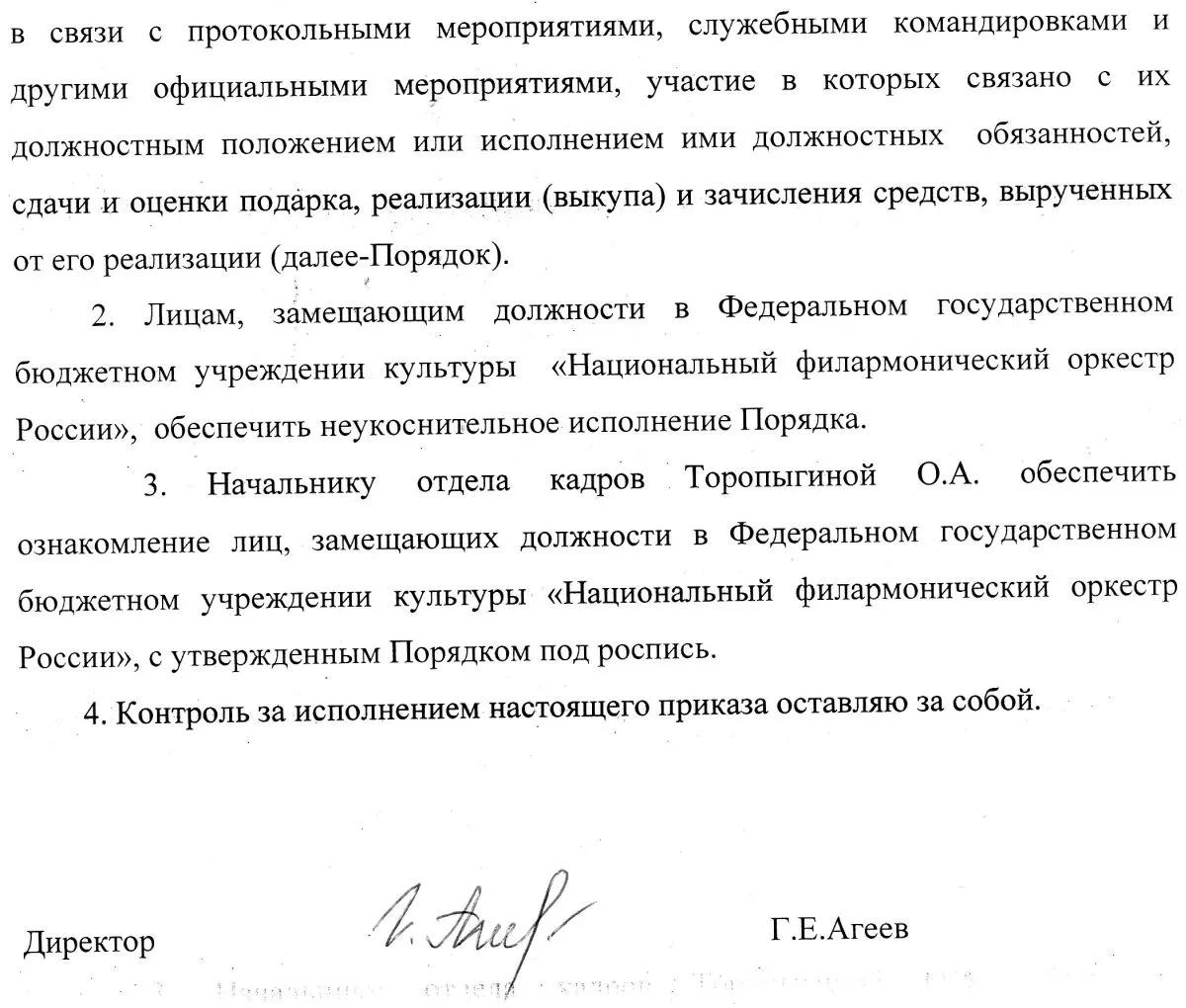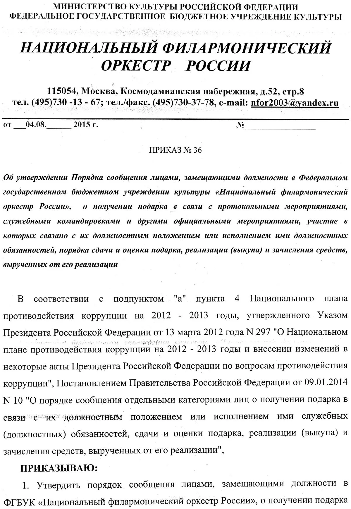 (Приказ № 36) Порядок сообщения лицами, замещающими должности в ФГБУК «Национальный филармонический оркестр России», о получении подарка в связи с протокольными мероприятиями, служебными командировками и другими официальными мероприятиями, участие в которых связано с их должностным положением или исполнением ими должностных обязанностей, порядка сдачи и оценки подарка, реализации (выкупа) и зачисления средств, вырученных от его реализации